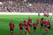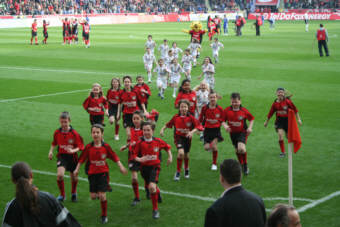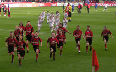 Zu den Klängen von „Bitter Sweet Symphony“ liefen die Kinder Hand in Hand mit den Profis auf den Platz inmitten der mit 22500 Zuschauern bis auf den letzten Platz besetzten