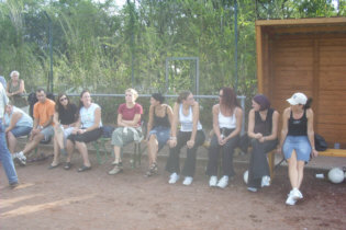 Foto - links: Der Fanclub “Die Spielfrauen e.V.” hatte an alles gedacht. Zur BUSFAHRT wurde alles eingeladen, was FRAU so alles braucht beim Fussballspiel: Decken,