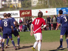 die Flanke vors Tor, wo ein Zeltinger im Kopfhöhe mit dem Fuß vor Nico klärt - (45.) Nach einem tollen Diagonalpass von Sascha in den Lauf von Nico, läuft dieser allein auf den Torwart zu. Der Torwart