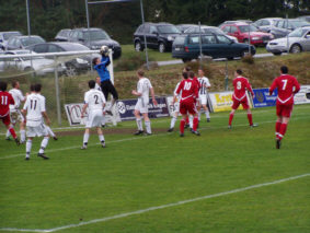 folgt auch die Zeit, wo die Gäste (in Überzahl) zu gefährlichen Chancen kommt: (82.) Nach einem Freistoß faustet Domenik den Ball zur Seite, der folgende Kopfball aus 10m geht schräg nur knapp vorbei