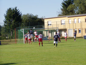 beherztes Kopfballspiel aller Abwehrspieler retteten die knappe Führung zur Halbzeitpause.