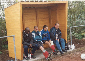 âErgĂ€nzungsspielerâ und das Trainer-/Betreuerteam in einer Spielerkabine aus Massivholz Platz nehmen.