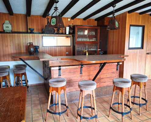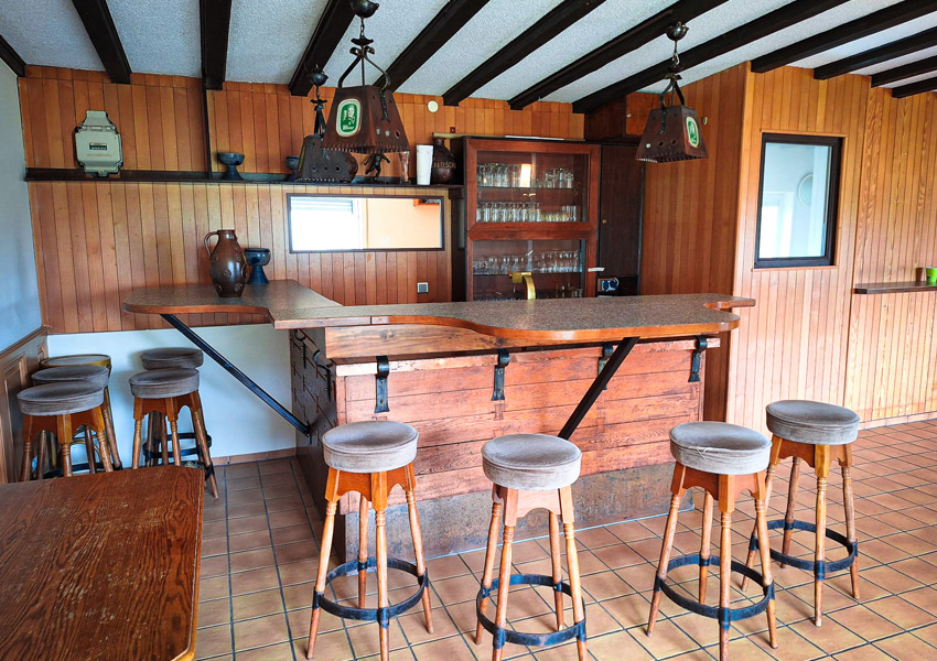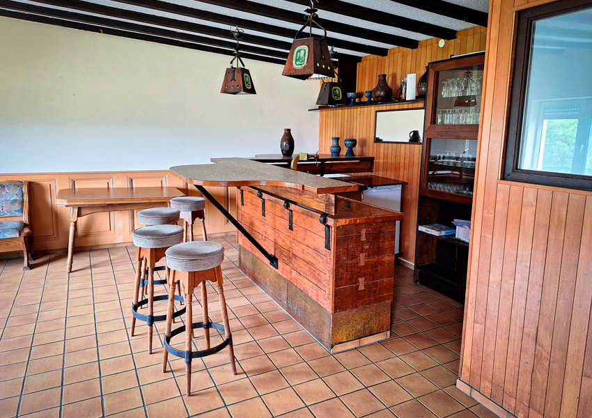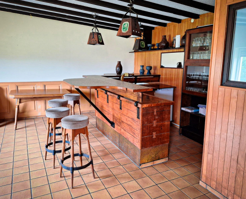 An einer Wandseite ist Platz für ein Büffet und in einem Nebenraum ist noch ein Garderobenraum. Bei Bedarf kann die zweiflügelige Tür zwischen Schankraum und “gute Stube” geöffnet werden.